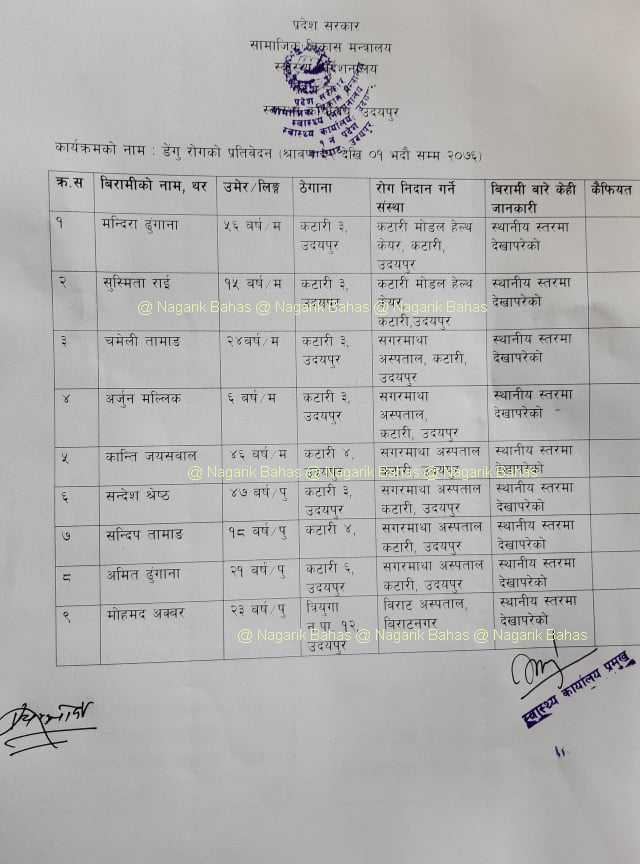 श्रावण २० गतेदेखि भदौं २ गतेसम्मको डेंगु संक्रमितको विवरण