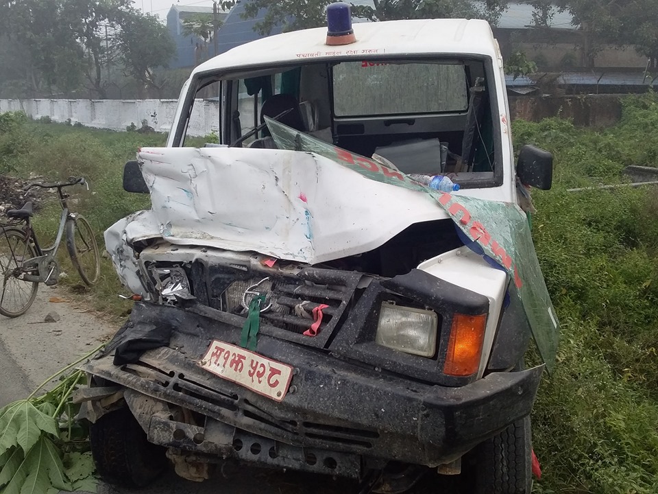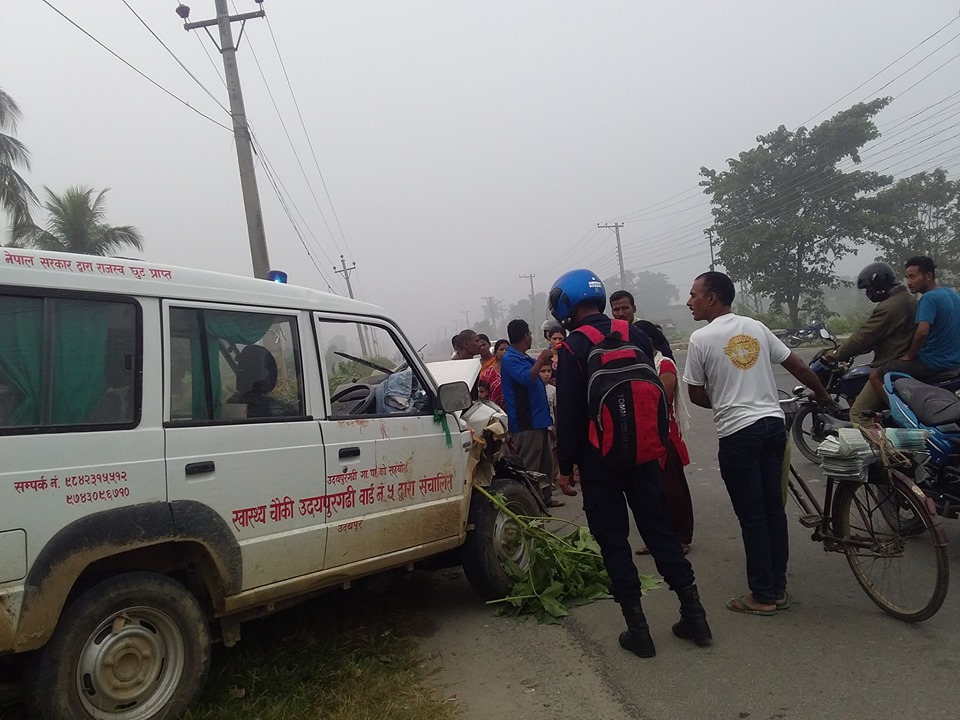 बिरामी बोकेर विराटनगरतफै जाँदै गरेको स.१ झ ५२८ नम्बरको एम्बुलेन्सको अगाडीको अधिकांश भाग क्षती पुगेको छ । एम्बुलेन्समा रहेका चालक र विरामीको अवस्था खतरामुक्त रहेको उदयपुरगढी गाउँपालिका ५ का वडाध्यक्ष कुमार अधिकारीले जानकारी दिए । उनका अनुसार उदयपुरगढी ४ को विरामी बोकेर बिराटनगरतर्फ जादै गर्दा दुहवीमा दुर्घटनामा परेको जानकारी दिए । ‘चालक सहित चार जना एम्बुलेन्समा रहेकोमा चारै जना खतरामुक्त छन् ।’ वडा अध्यक्ष अधिकारीले भने ‘चालकसँग सम्पर्क गर्दा कसैलाई केही नभएको जानकारी दिइएको छ ।’
