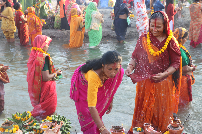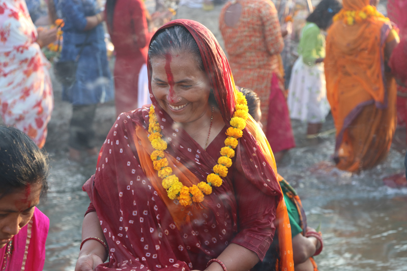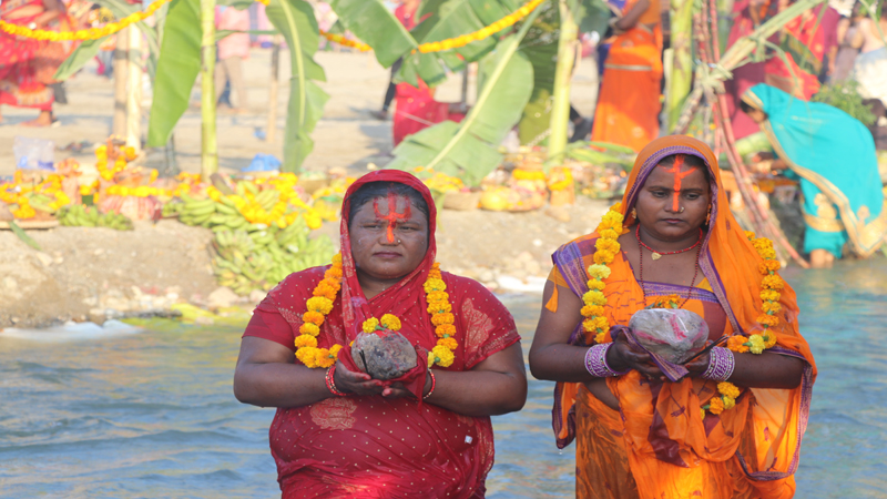 धार्मिक आ स्थाः अस्ताउँदो सूर्यलाई अर्घ्य दिन वर्तमान प्रदेश नं. १ का सांसद सुनिता कुमारी चौधरी त्रियुगा नदीमा । तस्विर : नागरिक बहस डट कम