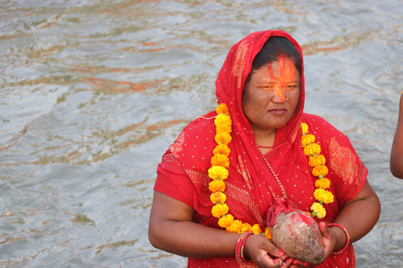 धार्मिक आ स्थाः अस्ताउँदो सूर्यलाई अर्घ्य दिन पूर्व सांसद तथा शहरी विकास राज्य मन्त्री मन्जु कुमारी चौधरी त्रियुगा नदीमा । तस्विर : नागरिक बहस डट कम
