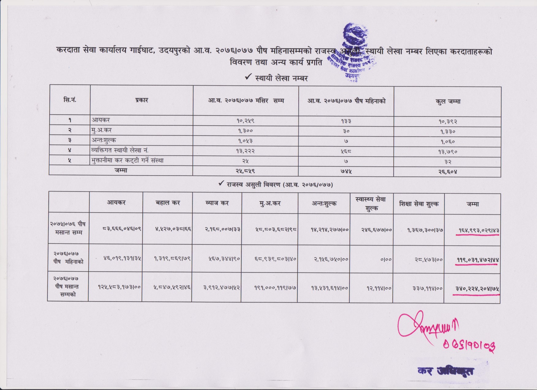 उनका अनुसार आय कर वापत १२ करोड ५५ लाख ८३ हजार १७३ रुपैया, बहाल कर वापत ५८ लाख ४७ हजार ५९२ रुपैया ४६ पैसा, व्याज कर वापत ३९ लाख १२ हजार ४७७ रुपैया ५२ पैसा, मूल्य अभिवृधि वापत १९ करोड १० लाख ११९ रुपैया ७७ पैसा, अन्तः शुल्क वापत १ करोड ३५ लाख ३१ हजार ६१४ रुपैया, स्वास्थ्य सेवा शुल्क वापत १२ हजार ११४ रुपैया र शिक्षा सेवा शुल्क वापत ३ लाख ३७ हजार ११४ रुपैया कर संकलन भएको कार्यालय प्रमुख बुढाथोकीले जानकारी दिए ।